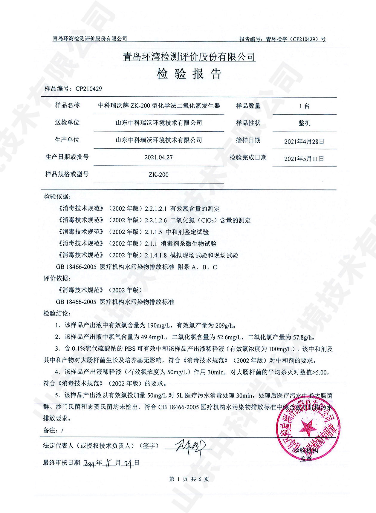 醫(yī)療污水處理設(shè)備檢測報告~二氧化氯消毒